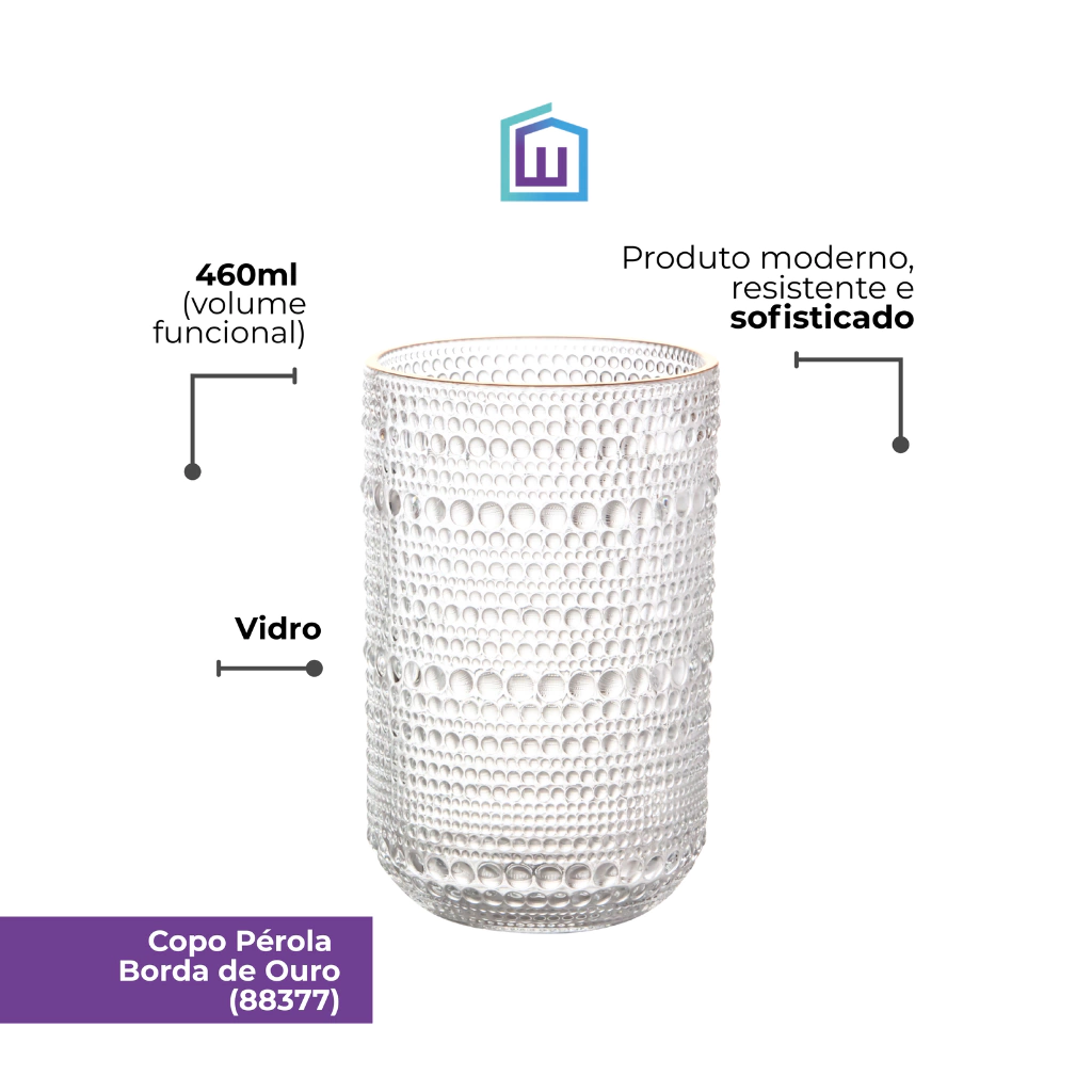 Conteúdo da Embalagem: 1 Jogo C/ 6 Copos de Vidro Pérola Transparente C/ Borda Dourada 460ml.