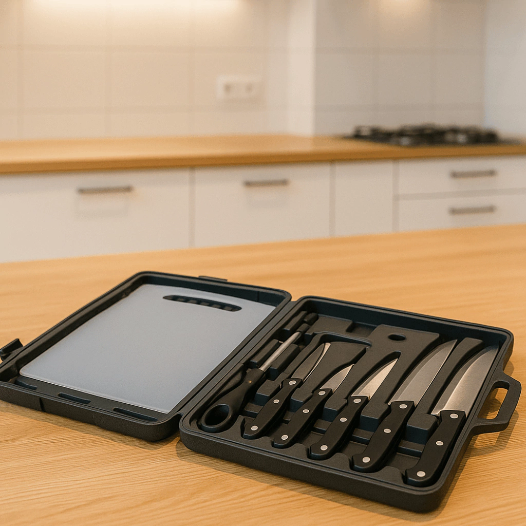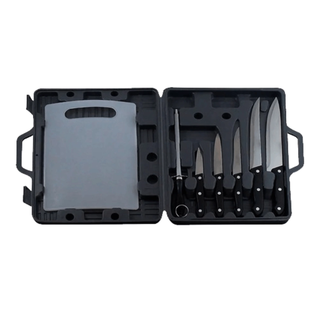 O Kit com 8 Peças Conjunto de Faqueiro com Mala é a opção ideal para quem busca praticidade, organização e elegância na cozinha. Composto por facas afiadas e versáteis, ideais para o corte preciso de carnes, legumes, frutas e outros alimentos, o conjunto oferece alto desempenho e durabilidade no uso diário. As lâminas são fabricadas com materiais de qualidade, garantindo resistência e cortes eficientes, enquanto os cabos anatômicos proporcionam segurança, conforto e firmeza durante o manuseio. Acompanha uma mala prática e resistente, perfeita para armazenar, proteger e transportar os utensílios de forma organizada e segura, sendo ideal tanto para uso doméstico quanto para profissionais da área gastronômica. Com design moderno e acabamento sofisticado, o Kit 8 Peças Conjunto de Faqueiro com Mala é completo, funcional e indispensável para quem valoriza qualidade, estilo e desempenho na hora de cozinhar ou servir.