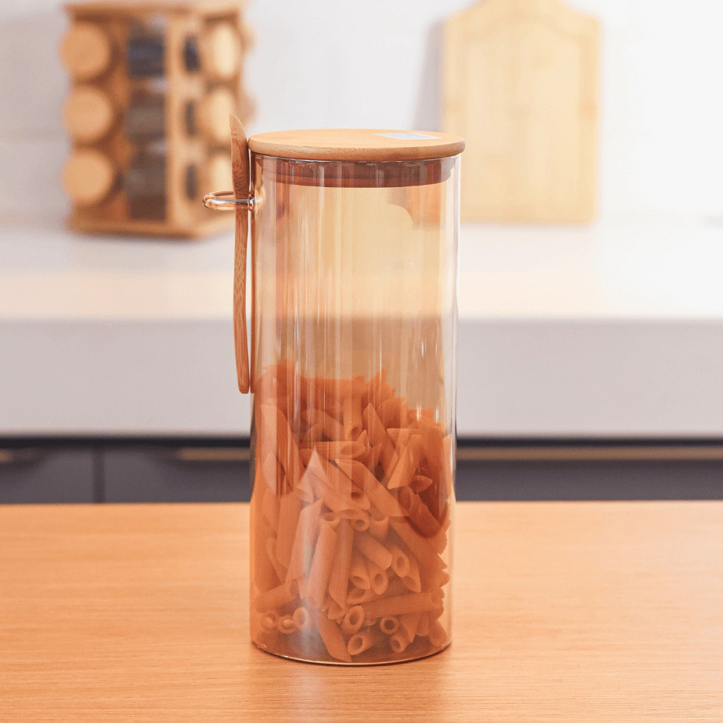 Pote de Vidro Hermético Borossilicato Redondo Âmbar C/Colher 1300ml Mantimentos Grãos Decoração Cozinha